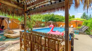 Rare opportunity to own a home in Timberwood Estates! Large 2.5-acre lot with mature trees and a creek with a bridge! Home has so many great features and living spaces - from the updated kitchen to the tropical pool area complete with realistic palm trees & a white sand tiki bar, two permanent pergolas and a shower/changing area! The oversized primary suite on upper level features two huge walk-in closets, infrared sauna, double sinks, whirlpool tub, stand-up shower, a wall of windows and a spiral staircase leading down to the three season porch. Upper level also features two additional bedrooms (one with a screened porch) and full bath (with space to add a 2nd laundry). Main floor features a huge foyer, family room, two formal dining rooms, formal living room w/fireplace, laundry/mudroom, four season porch/sunroom, three season porch, screened porch, spacious bedroom (or use as office) and 3/4 bath. Basement features a huge family room w/pool table (stays with home unless specifically excluded), large wet bar area, 3/4 bath, bonus room and workshop. You will love spending time outdoors - tropical pool area, year-round hot tub, two decks, walk-in raised garden, shed, fire pit, 6-hole frisbee golf course, practice golf range, beautiful landscaping, etc - and if that isn't enough there is easy access to nearby parks and trails. So many recent improvements - too many to list here so please see the supplements for a complete list!