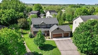 Fantastic home backing up to scenic Meadow View Park! This beautifully maintained home welcomes you with a 2-story foyer and open staircase. Main level features 9' volume ceilings, den, mudroom, laundry, and half bath, with stained maple hardwood floors and gas fireplace in the living room. Kitchen has been extensively updated with quartz countertops, stainless steel appliances, new faucet, added storage cabinets, and refinished ceilings. Dining area with access to new composite deck and fenced backyard. Upstairs offers 4 bedrooms, all with hardwood floors, including a spacious primary suite with walk-in closet and updated full bath with new tub, tile surround, and LVP flooring. Lower level includes newly finished office with LVP flooring, family room with walkout, and ample storage. Heated 3 car garage. Recent improvements include: new roof in 2023, newer top of the line high efficiency furnace & A/C in 2020, new composite deck & aluminum rails, newer insulated garage door & tracks, fresh interior paint, newer carpet on stairs, upgraded smart thermostat, updated lighting, and more! A must see!