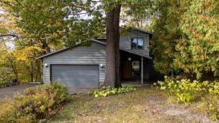 Discover the perfect blend of privacy and convenience in this distinctive custom home located in the heart of town. Tucked among the trees, this property offers the feel of a private retreat while being just minutes from schools, shopping, trails, and more. Conveniently situated just two blocks west of Robert J. Elkington Middle School and a mile from Crystal Lake. The landscaped path leads you to a covered porch entry, and stepping inside you’re greeted by breathtaking treetop views framed by floor-to-ceiling windows that fill the home with natural light. The unique design features two bedrooms and a versatile loft upstairs—ideal for a third bedroom, office, or creative space. The lower level is equally impressive, with a walkout family room, cozy gas fireplace, and a flexible private studio area complete with a Murphy bed—perfect for guests. This space is included in the third-bedroom count on the MLS listing. A large storage room on the lower level, along with generous entry and linen closets, ensures everything has its place. Convenience continues with main-floor laundry and an attached heated garage. Outside, the adjacent city lot offers room to expand or simply enjoy additional space and privacy. This truly one-of-a-kind residence combines character, comfort, and a serene natural setting—all within city limits