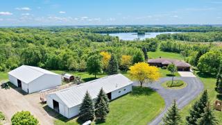 Discover an Exceptional Living Experience, Magnificent Estate offering Stunning Rambler Home on 93 Acres of Pristine Land complete with Outbuildings, Stream and Lakeshore on Union Lake! Covered Front Porch and Spacious Foyer provide the initial welcome. Stunning Two-story Great Room with a full wall of windows, perfect for capturing the Panoramic Views! Main Level Living Room with Brick Fireplace and Large Corner Windows, Formal Dining Room with Hardwood Flooring and Built-in Hutch and Large Corner Windows. Renovated Kitchen includes White Cabinetry, Granite Countertops, Tile Backsplash, Stainless Appliances, Walk-in Pantry and Tile Flooring. Informal Dining with Beautiful Views and Access to the Wrap-around Deck with Covered Trellis. Primary Suite offers Hardwood Floors, Corner Windows, Walk-in Closet and Renovated Ensuite Bath. Cozy Office, perfect for Work from Home, plus Laundry and ½ bath on Main Level. Two Story Great Room with incredible Full Height Masonry Fireplace welcomes you to the Lower Level. Entertain in Style while Enjoying the Views. Additional Amusement Room is perfect for a Playroom, Home Gym or Theatre Setup. 4 Generous bedrooms on this level have Large Corner Windows, Ample Closet space and Neutral Decor plus nearby Full Bath with Sauna. New Heating/Cooling System in 2019. Lots of Storage Space and Wine Cellar! Pristine Acreage includes gently Rolling Terrain with some Level Meadows, Tillable Fields with Hay and Alfalfa, (pesticide-free) Areas of Old Growth Timber, and 3 Miles of ATV & Walking Trails. Follow the Stream, over the Sturdy Bridge to a Perfect Campsite, offering Views of Union Lake. This Legacy Property also features 2 very large Pole Barns; one is exceptionally equipped with concrete floors, heating, air conditioning, and fiber optic internet, offering versatile space for hobbies or business. The second pole barn provides ample storage with a partial concrete floor and a large area for vehicles, sports equipment, or recreational toys. Adjacent Garden area with protective fencing and Storage Shed plus a Pollinator Garden for Bees. Embrace an active lifestyle with three miles of private trails, perfect for ATV riding, hiking, cross-country skiing, snowshoeing, and horseback riding. Expand your activities with kayaking, boating, paddleboarding, fishing or archery! This property truly offers a blend of luxurious living and unparalleled outdoor recreation.
