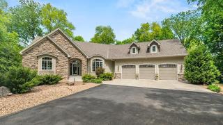 This custom-built, one-level home sits on 2.5 beautifully landscaped acres directly across from The Ridges at Sand Creek Golf Course. Inside, soaring 12-foot ceilings, walnut hardwood floors, and rich knotty alder cabinetry create an atmosphere of warmth and sophistication. The great room features a custom brick fireplace, built-ins, and ceiling speakers, offering the perfect spot to unwind or gather with guests. A brick accent wall in the foyer and 8-foot doors throughout add a sense of architectural luxury. The chef’s kitchen is a true highlight, complete with a Wolf gas range, Sub-Zero refrigerator, Thermador double ovens, granite countertops, soft-close cabinetry, and a large walk-in pantry. Just off the kitchen, a pub-style sunroom overlooks the serene backyard. The main-level primary suite is a private retreat with his-and-hers walk-in closets and a spa-inspired bathroom featuring heated floors, a soaking tub, and a custom tiled walk-in shower. A second main-level bathroom includes a zero-barrier, roll-in tile shower—ideal for guests or age-in-place convenience. The finished lower level is built for entertainment, offering a full bar and a spacious rec room ready for movie nights, game days, or hosting the whole crew. Step outside to a maintenance-free deck and beautifully manicured yard with in-ground irrigation. The fully finished garage includes epoxy floors, heat, extra storage...a dream garage! A detached shed offers even more room for hobbies or equipment. This home offers a rare combination of luxury, location, and livability—tucked in a quiet golf course community with the privacy and space to truly enjoy it.