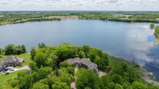 A winding, wooded lane leads to a sprawling one story walk-out sited on 15 acres with scenic landscape and sandy shoreline. Idyllic MN living in all seasons. West facing panoramic views command your attention throughout the architectural floor plan. Gathering areas are spacious, baths are luxurious, with every desired amenity. A grand double-sided fireplace offers gentle separation to an otherwise open plan. Spacious rooms, soaring ceilings, 8 ft doors, custom Pennsylvania Cherry Wood, granite and porcelain along with maple hardwood provide timeless sophistication. The well-appointed Chef’s kitchen is equipped with Subzero and Jenn-Air appliances, and built in seating, it is open to the standout formal dining area with custom dining table clad with matching granite. Everything required for your entertaining and culinary needs is here. The butler’s pantry is a full second kitchen thoughtfully designed for prepping and hosting. When it’s time to unwind, retreat to the primary suite, where you find comfort, pleasure, stunning views and enjoy a double-sided fireplace. The walk-in closet is boutique-like and offers access to the well-appointed laundry. There is a lovely mother-in-law suite, spacious, open plan with a balcony and west facing waterfront views. There is a laundry hook up. The walk out basement offers another 5100 SF, has plumbing roughed in and 4 more garage stalls. This Estate provides gorgeous natural light, 2 home office options, quality materials, privacy, recreation opportunities, tremendous storage throughout, and a great location just 29 mi. from the Twin Cities. Impressively maintained with newer roof, new maintenance free decks, fresh exterior, fiberglass windows, high quality mechanicals, gorgeous gazebo at the waterfront. Tranquil, Artful Living. Welcome Home. Reach out today.