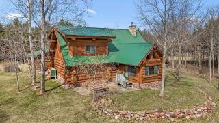 Heavily wooded and private 10 Acre estate with fruit trees and berry bushes. Incredible deer hunting. Swedish full scribed log home construction with 90 year old white pines, hard maple stair railings, metal roof, two car garage and a 64X36 pole shed. Vaulted ceilings with large windows let in lots of natural light. Hardwood floors throughout main level. Custom wood kitchen cabinets with center island and white appliances are open to the informal dining and living room with wood burning stove. Cheery four season porch takes in incredible views of nature. Main floor primary bedroom with ¾ bath and mudroom. Upper-level loft with two spacious bedrooms and full bath. Unfinished lower level lets you put on your own touches or provides tons of storage. Just 1 hour and 45 minutes from the Twin Cities. See 3D tour and video for your own private showing today.