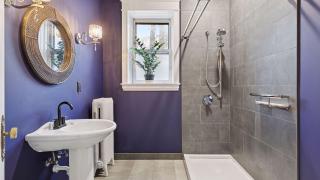 The professionally remodeled high-end bathroom, completed by Lemke & Sons, is a standout feature. It offers a spacious walk-in shower with floor-to-ceiling tile, luxury vinyl tile flooring, updated fixtures, and bold designer wall color paired with elegant lighting. The space blends historic radiators and trim with modern finishes for a truly polished feel.
