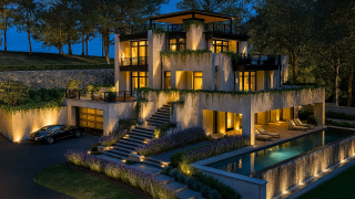 This striking contemporary residence seamlessly blends architectural sophistication with natural harmony, creating an urban oasis that feels worlds away from city life. Nestled on a private wooded lot, the home's clean stucco exterior and expansive floor-to-ceiling windows provide a serene backdrop that allows the surrounding forest canopy to take center stage. The three-story design embraces a philosophy of indoor-outdoor living, where each level extends beyond its walls through thoughtfully planned terraces and balconies, culminating in an expansive covered rooftop terrace that offers seasonal glimpses of the distant lake through the changing foliage.