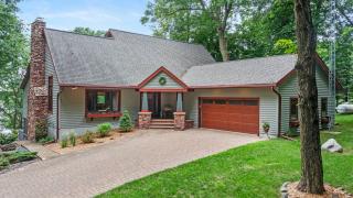 This executive lake home is located on spectacular Bear Lake. This updated & quality built home not only has a fantastic floor plan it also features a stunning floor to ceiling wood burning fireplace that greets you as you walk in the main door. Updated kitchen and dining area that are both set up for entertaining while taking in the lakeview. Freshly stained upper and lower deck embraces entertaining. Complete main level living with gorgeous hard wood floors, primary suite with attached office and primary bath with a steam shower. Upstairs you will find two more bedrooms along with a full bath and more storage. The lower level has a cozy family room with a gas fireplace leading out to a screen porch for evening relaxation. Recreational room leads to another bedroom and full bath. Additional storage in the utility room and built in storage as well. The 2-car-attached garage gives you plenty of space that leads into the laundry room. Outside gorgeous perennials and landscaping take in the natural surroundings. You also have your own pickle ball/basketball court! A one of kind gem located close to Hwy 53 for great access from any direction & on a wonderful recreational lake.