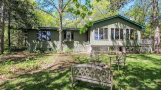 Big Sandy Lake's Bell Horn Bay-4 bedroom year round home on 3.15 acres. Large waterfront windows provide lake views from the vaulted sun room with skylights, the kitchen horticultural window, and the king size main bedroom. East facing home for sunrises on the lake. Across the road is a path that reaches the flowage facing west for watching wildlife and sunsets. The home features tongue & groove knotty pine walls and a coffered ceiling, tile floors throughout with wood floor in the sunroom and carpeted bedrooms. Gas fireplace, a large jetted tub in the main bedroom, extra large hot water heater, Steffes furnace, off peak electric, central air, Anderson windows, Levelor cordless shades, main floor laundry closet, large lower level storage room with plenty of shelves, and two closets, hardwood oak kitchen cabinets, new refrigerator in May 2025. Single garage 16x24, double garage is 24x30. The aluminum dock, swimming raft and the boat lift are included. Home is being sold TURNKEY, just bring your flip-flops!