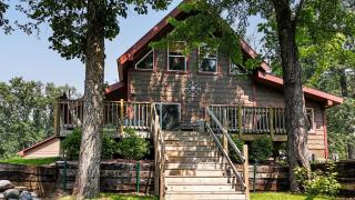 BIG SANDY LAKE year round cabin. The cabin has a woodsy up north feel with natural wood work, a gas burning fireplace, a huge loft that sleeps at least 10 people, walks out to a lakeside deck that wraps around to a covered porch. Plenty of storage space with a brand new pole building, two storage sheds, a detached garage with a wood shop, storage area, man cave and a 3/4 bath. This is a double lot with 200' of shoreline and is1.69 acres. The dock, beds and beautiful cabin furniture is included.