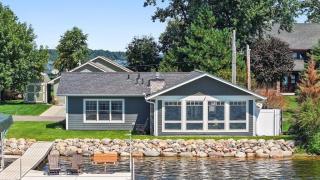 THE PERFECT GULL LAKE COTTAGE. Built by one of the area's finest builders, this 3-bedroom, 2-bath, year-round home features a brilliant design that maximizes space while capturing stunning panoramic big lake views. If you've been dreaming about a cabin with flawlessly level elevation that sits right on the water's edge, this stunner is for you. The open floor plan design includes: vaulted ceilings, custom cabinets, granite countertops, hardwood and tile floors throughout, a gas-burning brick fireplace, main floor laundry, a large pantry, insulation to Category 1 standards, and a manicured yard with an underground sprinkler system. Located on the south shore of Gull Point, close to fine and casual dining, nightly entertainment, and multiple world-class golf courses.