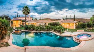 Spectacular 40 Acre Estate with Dramatic Views! Photos are a must see as words cannot describe how impressive this Charles Blaugrund design stands out. Enter through the private gated entrance up the plan lined private drive to a grand entrance. As you enter the home into the foyer with circular stair case, you are immediately drawn to the rear of the home with large arched windows that over look the valley and provide a very open and bright atmosphere to the entire home. Privacy and openness compliment each other in this architectural design. Family room kitchen and dining room are strategically placed for great flow and views. Formal living room, wet bar, den with fireplace, vaulted ceilings, ask and this home probably has it.