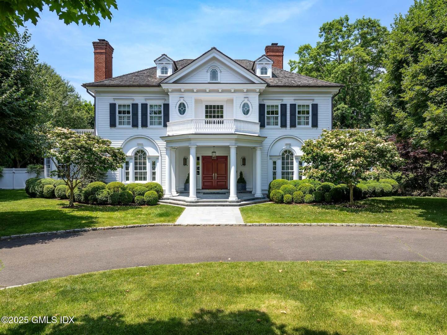 Sought after Riverside location showcases a stunning six-bedroom Colonial built by Sound Beach Partners with pool, porches, outdoor fireplace and grill on beautifully manicured .71 acre with private yard dotted with sequentially flowering trees. Offers easy access to trains, schools, water and Yacht Club. This pristine home exudes classic elegance with superb architectural details, wood floors, marble fireplaces and high ceilings. Dramatic double height entry leads into formal rooms with fireplaces, chef's kitchen with breakfast nook, family room with fireplace, library with wet bar and sunroom. Second floor boasts primary suite with balcony, walk-in closets; plus five bedrooms and four full baths. Play/rec room, gym, full bath and attached three-car garage complete lower level.
