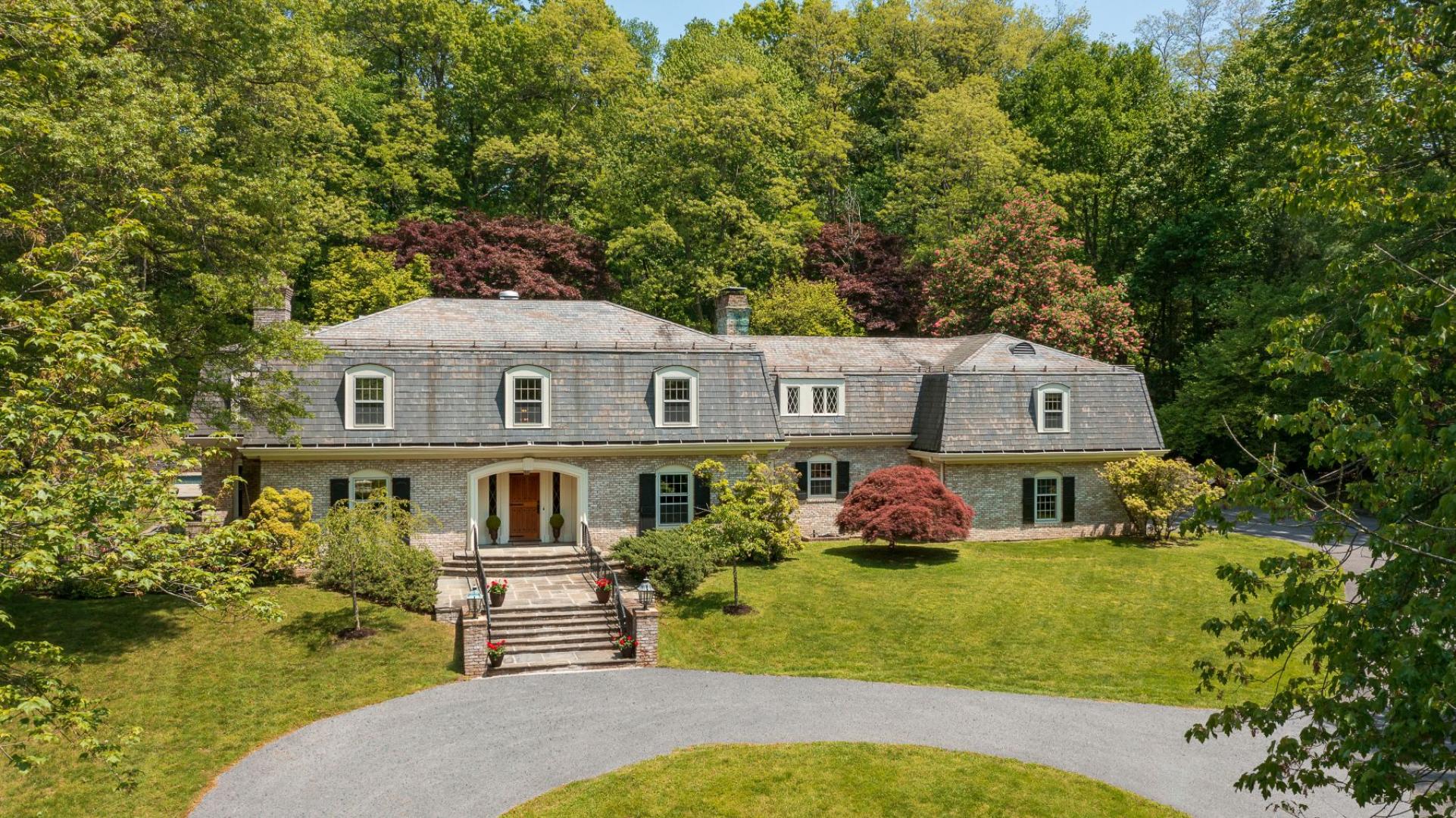On 5+ acres across from the Cross River Reservoir, this gracious and inviting home is an entertainer's paradise with commutable convenience to Manhattan. Treat yourself to an iconique, custom French country manor privately built by renowned Katonah architect Bruce Helmes. The 6100 SF gated home with gorgeous, recently up-graded saltwater pool, covered terrace and mature magnolia and chestnut trees render this an earthly paradise for all-season entertaining and weekend getaways. So much to admire here! The masterful mansard roof with dormers letting in abundant natural light, the signature bleached-brick, the lattice windows and custom French country exterior doors all exhibit a flair for old world elements modified for today's luxury lifestyle. Walking into the house feels like a curated experience with a sleek entrance hall with winding staircase and doors to an elegant wood-paneled office on one side and, on the other, steps down to the sumptuously appointed modern living room