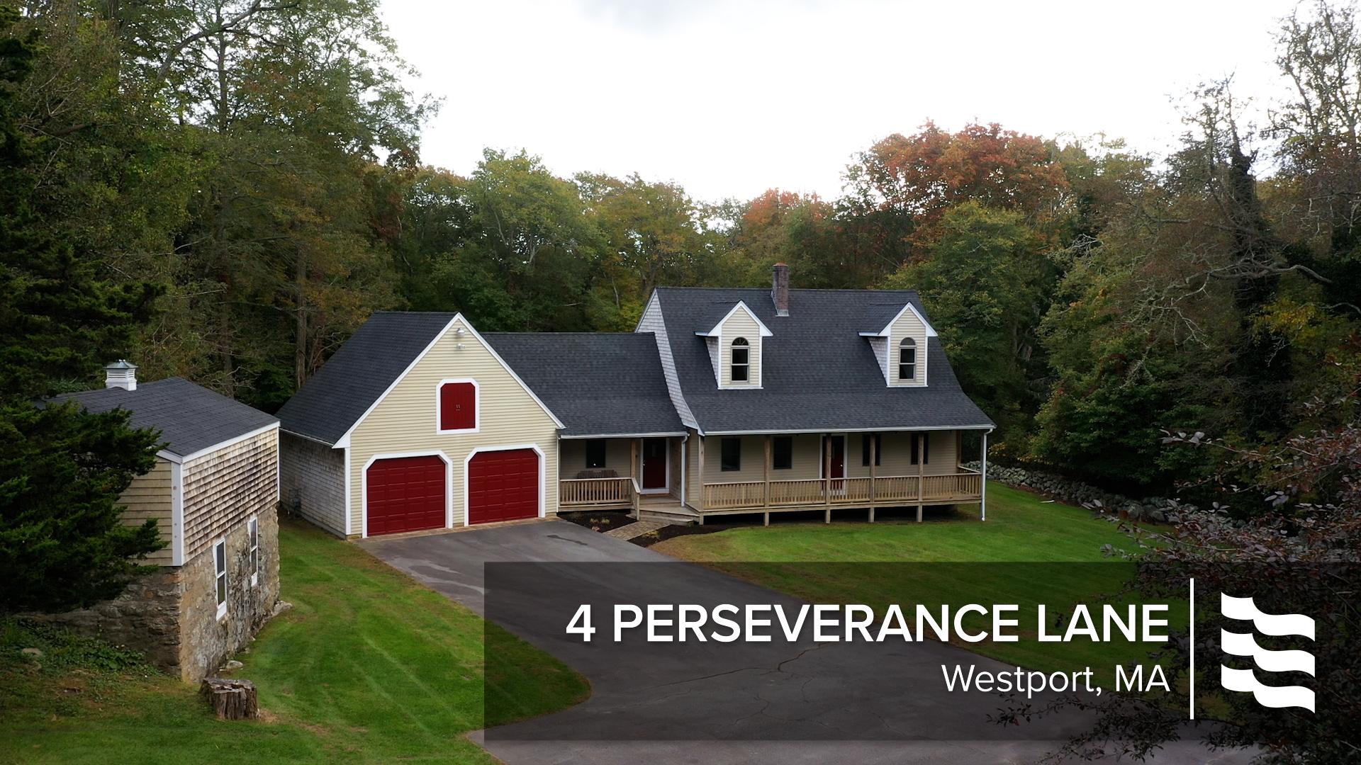 Welcome to 4 Perseverance Lane. Situdated on a tranquil 36,000 + sq. ft. lot in the heart of South Westport, this cape with farmer's porch offers FIRST FLOOR LIVING. A half wall separates the living room from the open kitchen/dining area with access to the back deck. Ktichen peninsula provides extra seating while the island provides extra workspace. Hallway leads to beddroom with hardwood floors, bath with shower, and mudroom entrance with laundry. Two spacious bedrooms and full bath are located on the second floor. Extra storage includes walk in attic and unique mini garage area. Pristine woodwork throughout. New roof. Enchanting outbuilding. While still close to Providence and Boston, you can enjoy coastal living at its best. Make Westport your home.