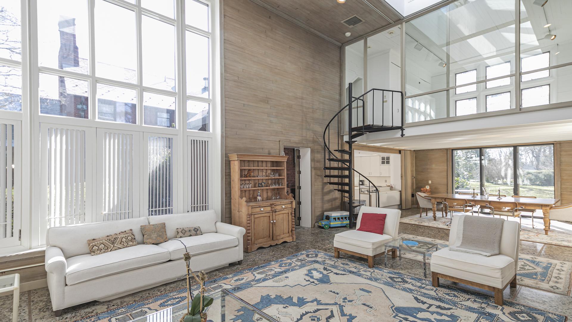 If ordinary is out of the question and beautifully maintained surroundings seconds from town are a must, this Constitution Hill condo within the mansion will top your list! Available for the very first time since the conversion from private Morgan estate to sensitively divided luxury condos, #6 just may be the most surprising and dramatic of the mansion residences. The 2-story living room is positively drenched in sun from a massive skylight and windows stacked 4 tiers high. Guests will be intrigued by the unusual space with its wood walls and stone-flecked concrete floor, as well as the lofted bedroom above atop a spiral staircase. Upon learning they were the Morgans’ squash court and viewing deck, it all becomes clear and visions of spirited, long-ago matches are fun to imagine. The dining room and kitchen are open to one another to suit modern entertaining. Both bedrooms have their own nicely-sized bathroom. While there are spots for tucking items away in the laundry room and the foyer featuring exposed brick, ample secure storage can be found in the basement and attic of the mansion. Currently, the den serves as a segue into condo #5, also offered for purchase. Be sure to take a moment to sit on the private stone patio and enjoy the park-like grounds, which include a pool and tennis court. Your own two-car garage as well.