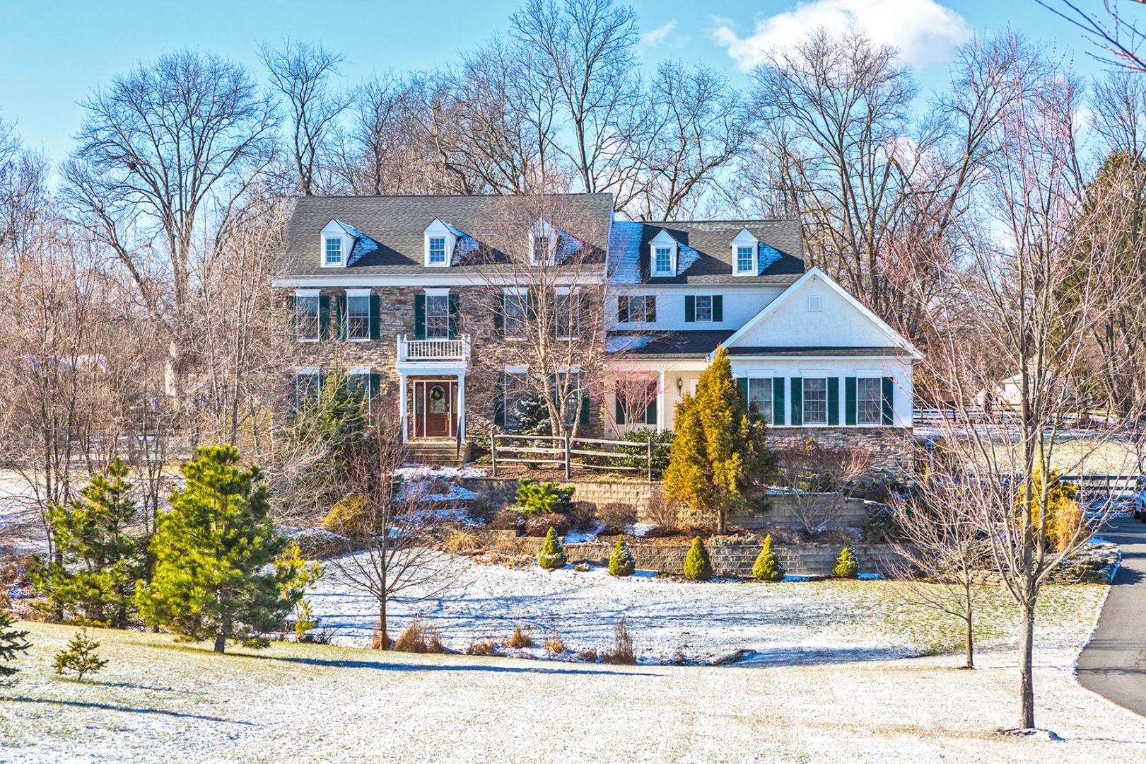 Superbly dressed both inside and out, this Toll Brothers beauty is set back from the road on a peaceful parcel in much-loved Hunterdon Hills. A wide entry hall introduces an interior that’s as handsome as the exterior suggests. Paneled wainscoting, rich moldings, and many upgrades are just some of the luxuries found throughout this Raritan Township home. A walk through the generously-sized rooms reveals formal dining accented by decorative pillars across from a well-trimmed living room. The sunken family room is past the main staircase and features a stacked stone fireplace. A broad hall leads to the study and charming powder room. At the opposite end, the masterful kitchen and breakfast room satisfies beyond expectation. Cherry cabinetry and stainless steel are complemented by granite surfaces which include an expansive island with counter seating. Multiple windows provide idyllic views and an atrium door leads to the patio and fenced rear yard. A second back staircase is near the laundry room. There is also access to a covered front porch. A bonus room emblematic of Toll Brothers exceptional construction sits on the opposite side of the kitchen, providing another place to entertain. The second floor is open and spacious with four bedrooms, all en suite. The master is especially indulgent with a sitting room, huge walk-in closet and lavish bath showcasing a Jacuzzi tub and freestanding shower.