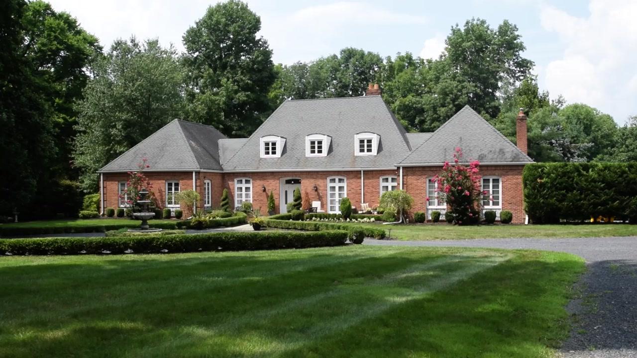 Set well back on a sprawling 2.99-acre lot, this brick beauty with French Provincial flair sets a formal, yet gracious, tone. A circular driveway lined with boxwoods and a courtyard-style front terrace are perfectly manicured. Radiating from the roomy entrance foyer are the living room, dining room and an office with ceilings rising well over 9 feet high. Double doors give the option of privacy, while also providing added detail and decoration. The mood gets more casual as you reach the kitchen with a handy center island and double ovens set into a wall of whitewashed brick. The laundry room is adjacent, as well as a cozy family room with a brick fireplace, wet bar and sliders to the patio. More hang-out space can be found upstairs along with a private bedroom suite. Three more bedrooms, including the large master suite, are situated on the first floor within their own private wing. Outside, a border of thriving, mature trees lends total seclusion to both the main house and a self-sufficient guest cottage.