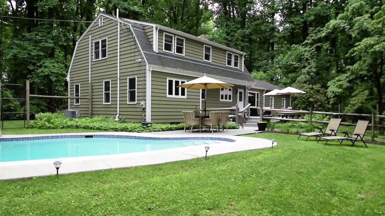 Surrounded by lush greenery with a tiered deck and a swimming pool, this home has a classic, Americana feel. The interior harmoniously expresses both heritage and modern architecture with rooms that have been opened up, kitchen with butcher block and granite counters, and updated bathrooms. Yet the beamed ceilings, a large brick hearth fireplace, and exposed brick accents create warmth in a surprisingly spacious floor plan. The main level includes the family room with doors to both front porch and the deck, an updated powder room, the living room, casual dining room and a cozy home office with built-in cabinetry. Above, find three spacious bedrooms and upgraded hall bath. The owner's bedroom includes a dressing and vanity area and full bath. There's hardwood and tile throughout the home, plenty of storage in the two-car garage and in the basement. Perfectly positioned to take advantage of a vacation lifestyle, Lambertville, New Hope, Stockton and Frenchtown are all within easy reach for a night on the town when not entertaining poolside.