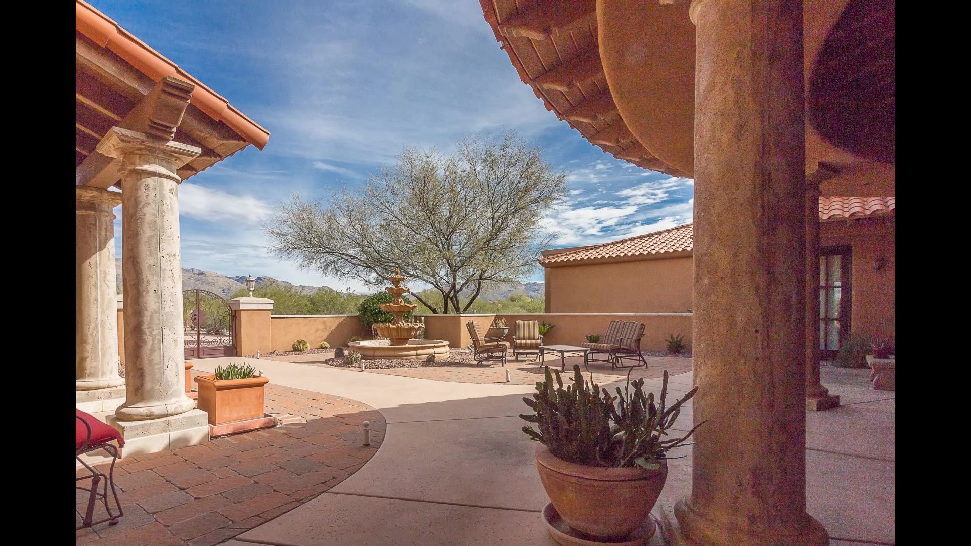 The moment you step from your automobile to enter the courtyard you know you have entered into an experience for emotional enlightenment. From the courtyard fountain to the 8 foot Pella entry door you will feel the personal resort that can be yours. As you step onto the travertine flooring within you will be seduced by the presented ambiance. Most noticeably the fresco inspired 22 foot high entry complimented with an extraordinary chandelier. The 14 foot high stained spruce ceiling stimulates the allure of this home as you step further. The kitchen will leave the chef in you salivating over its luxuriousness complimented by the encounter of spectacular sunsets. Master suite is presidential with fireplace, extraordinary master bath, personal sauna and walk-in closet.