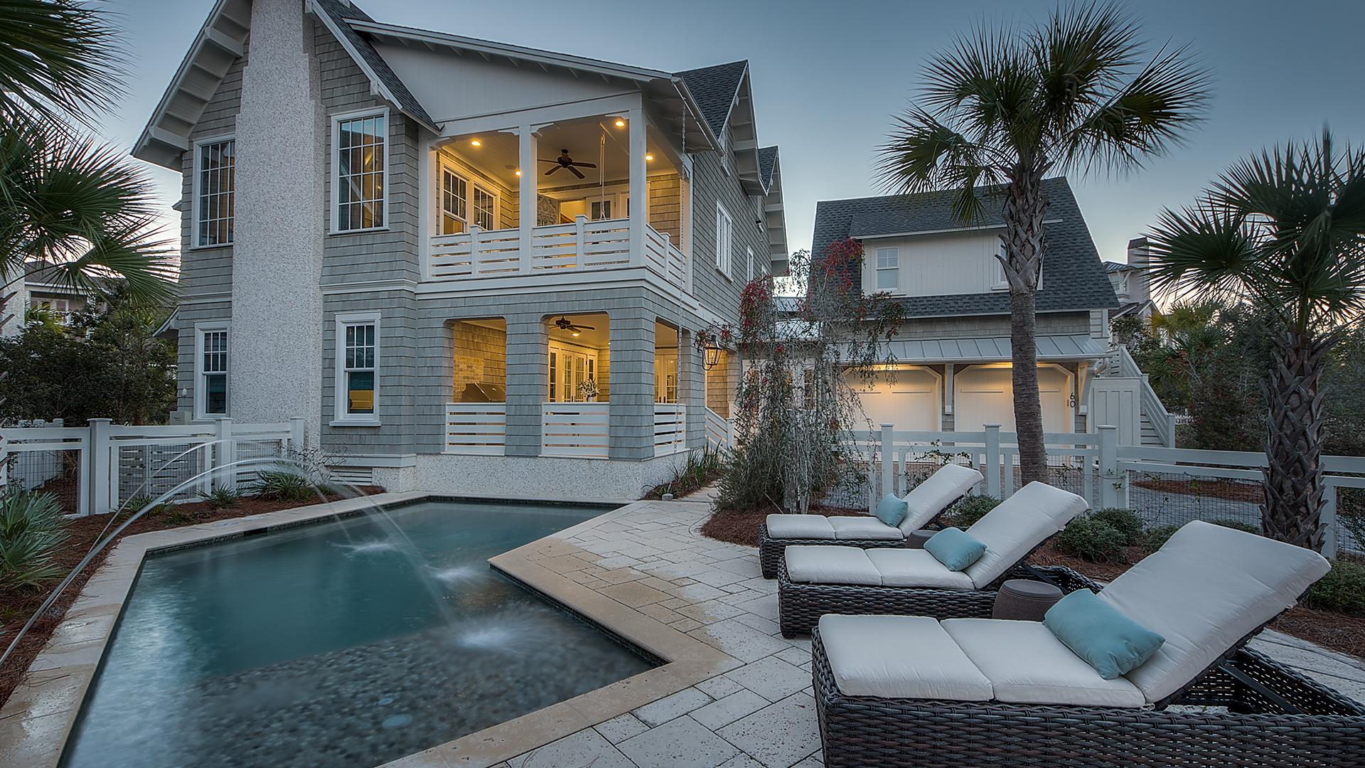 This Watersound Beach address radiates style, tranquility and exquisite taste. The soft hues of the impeccably decorated interior are accented with reclaimed oak hardwood floors, wrought iron stair case and chandeliers and a gorgeous, peaked and beamed cathedral ceiling in the dining area and living room. Perfect for entertaining, the large kitchen center island with marble countertops and gleaming Dacor stainless steel appliances make this an exquisite place to host family and friends. The expansive elegance of the great room concept raises the bar for amicable hospitality in stunning style. The home’s delight only continues in its outdoor space, complete with large heated pool with negative edge, fountains and copious room to relax in the sun.Take a break from swimming and enjoy a meal on the generous covered deck with dining and sitting area equipped with Dacor gas grill, refrigerator and ice maker. Enjoy spectacular views of the Gulf and scenic Deer Lake from one of the many balconies throughout the home. Step through a private court yard with calming water fountain and into a park area. On more than 250 acres of natural sand dunes, Watersound Beach residents enjoy a wonderful beach, bike paths and walkways, fine dining and a chic lifestyle that spotlights relaxation with a spirit of adventure.