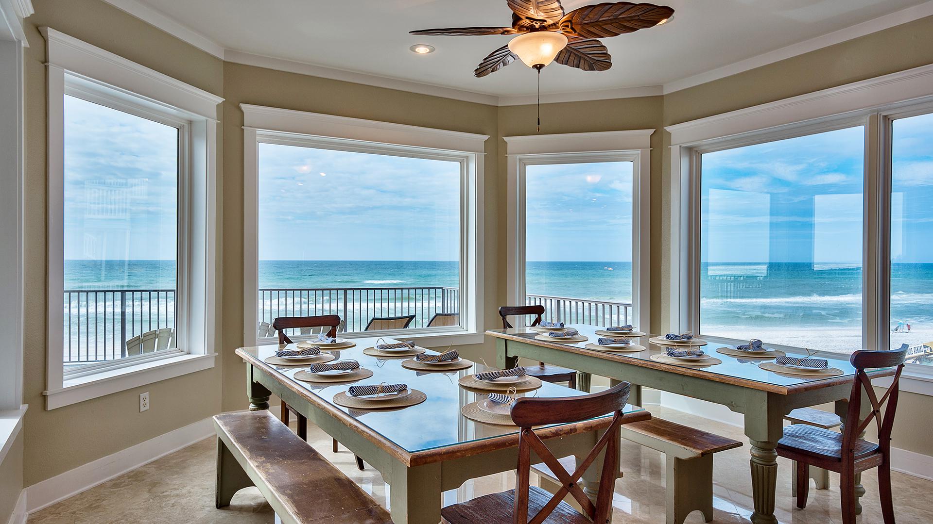 With forever panoramic views of the Gulf of Mexico, overlooking the heated gulf front swimming pool, and situated on a secluded street on top of a high dune in popular Seagrove Beach, this 10 bedroom, 11.5 bathroom masterpiece is beautifully detailed throughout to create a rich and warm retreat. One of the most significant properties in the area, with private access to 65 feet of stunning beach frontage, this 6,359 square foot custom estate is sure to impress. Designed for large gatherings, the harmonious open living spaces have high ceilings, travertine flooring and views galore. Paying meticulous attention to detail, the home is equipped with a private elevator for easy access to all three stories.The state of the art kitchen is the heart of the second floor and includes sub zero appliances, custom cabinetry, two dishwashers and many top of the line extras. This tranquil space overlooks one of the property's two inviting living rooms, complete with cozy fireplace. Step out onto the pool deck to enjoy a relaxing swim or take the private beach access to soak in the emerald green gulf waters.Each level of the home was carefully planned and decorated to flow seamlessly to create a well thought out ambiance you would expect from a luxury home. The third story includes a beautifully appointed master suite, complete with seating area to enjoy the captivating gulf views. The attached master spa like bath provides soaking tub, separate glassed in shower and dual sinks. The upper balcony is where you are guaranteed to witness some of the most beautiful sunsets Florida offers. With seven additional bedrooms in the home, including the first floor bunk room with two bathrooms on opposite sides, and spacious living area, this is an ideal location for families. The amazing property, with grand indoor and outdoor spaces, invites entertaining to a new scale, and ensures a beach lifestyle like no other.