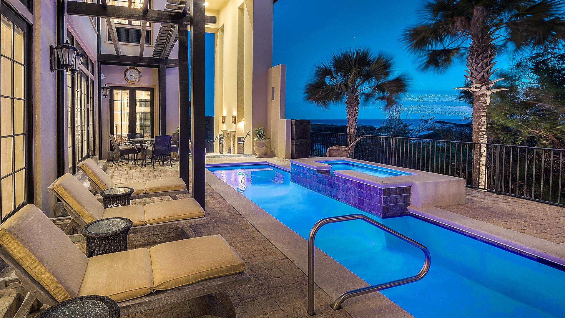 Overlooking a rare coastal dune lake with spectacular views of the Gulf of Mexico, this concrete-constructed legacy home was designed by renowned architect Dawn Thurber, Thurber Architects. Almost every room in this noble structure overlooks a layered vista of sugary dunes, sparkling lake and blue-green gulf. The generous pool deck, featuring a heated pool and hot tub, and multiple verandas offer respite for sun and shade lovers alike. The outdoor breezeway includes a wood-burning fireplace with gas logs and a Viking grill. A wood-paneled elevator services all three levels of this traditionally appointed home. Arched doorways, paneled doors, a three-story, wrought iron stair railing and stone floors create an authentic Old World, European-style atmosphere.The open living area features dramatic ceilings and large windows framing breathtaking views. The great room showcases a large gas fireplace and conceals a TV behind artwork.The huge, gourmet kitchen is anchored by a stunning mosaic backsplash plus a Wolf six-burner gas range with griddle, double oven, and warming drawer, Sub Zero refrigerator, ice maker and wine cooler in the butler's pantry, and Fisher Paykel dishwasher drawers.Six large bedrooms create plenty of room for family and guests. The ample master suite features a walk-in closet with island, sitting room, gas fireplace and large covered porch. The master bath includes a glass-enclosed shower with rainfall shower head and Jacuzzi tub. Each bedroom has its' own bath and two of the four guest suites are masters with double vanities.Other notable features include two sets of LG Tromm front-loading washer/dryers, second and third floor wet bars, whole-house generator, two-car garage and hurricane-rated windows and doors.